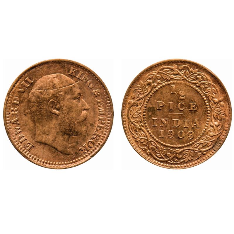 Edward VII, Bronze, 1/2 Pice, 1909, Calcutta Mint, No mint mark, Die cracks on Obv and Rev, Ghost on Obv and Rev. F. Prid # 743. GK 1010. Brilliant Uncirculated. Rare.