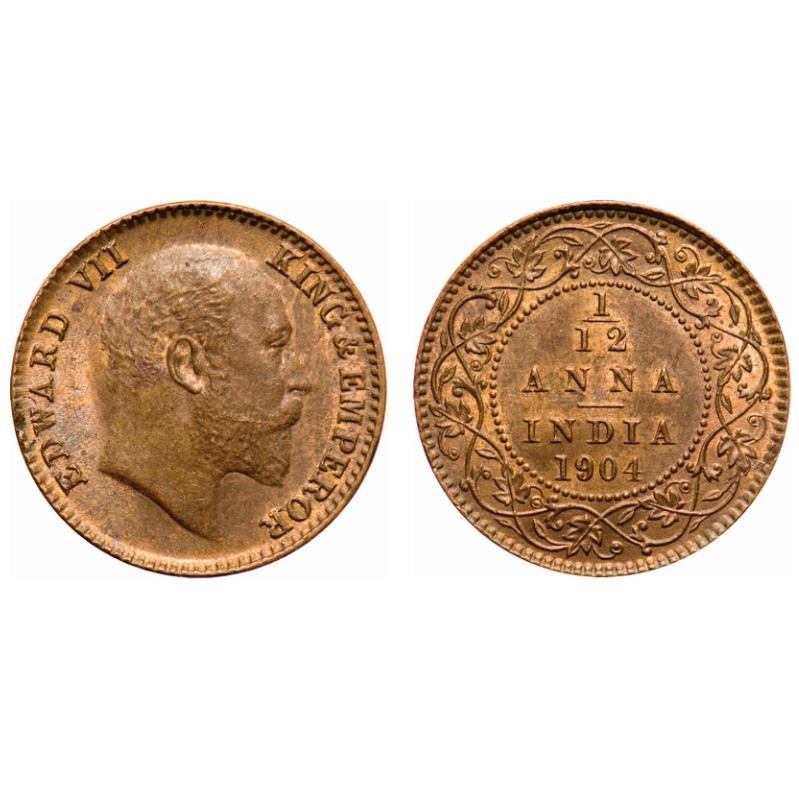 Edward VII, Copper, 1/12 Anna, 1904, Calcutta Mint, No mint mark, Die crack on Obv. F. Prid # 819. GK 1013. Almost Uncirculated. Scarce.