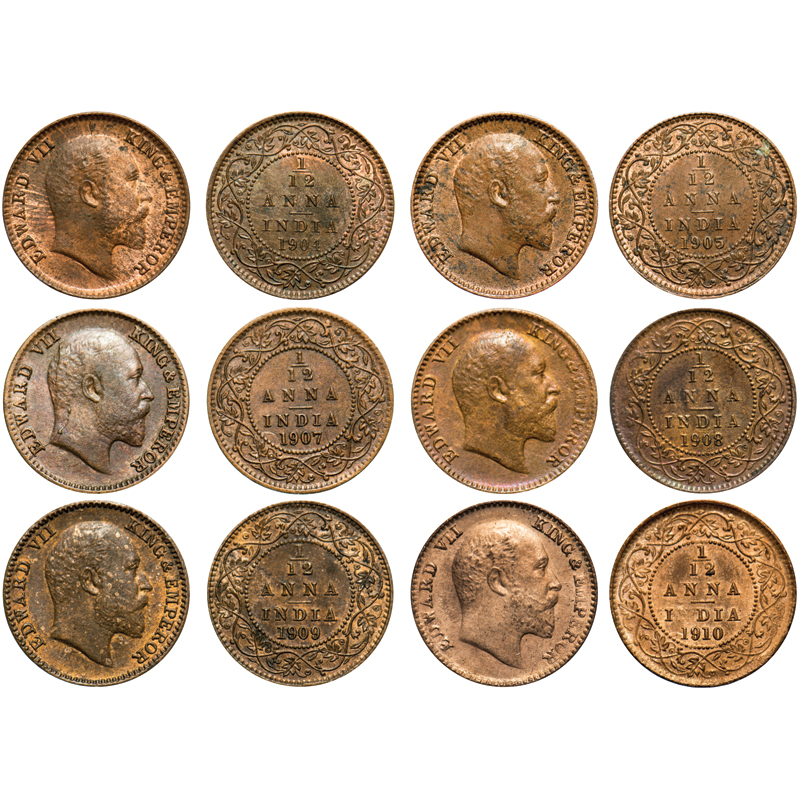 | Edward VII, Mix Metal, 1/12 Anna (6 coins), Calcutta Mint, No mint mark, 1) 1904, Copper, Die crack on Obv, 2) 1905, Copper, 3) 1907, Bronze, Ghost on Rev, Die cracks on Obv, 4) 1908, Bronze, 5) 1909, Bronze, 6) 1910, Bronze, Die crack on Rev. F. Prid # 819, 820, 823, 824, 825, 826. GK 1013, 1014, 1017, 1018, 1019, 1020. About Extremely Fine to About Uncirculated. Scarce as a lot. |