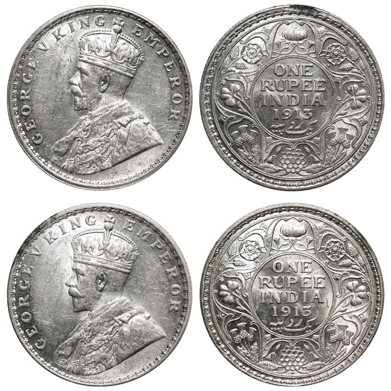 | George V, Silver, Rupee (2 coins), 1913, 1) Calcutta mint, No dot, 2) Bombay Mint, Dot. F. Prid # 209, 219. GK 1027, 1028. Brilliant Uncirculated. Rare as a set. |