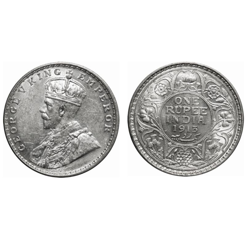 George V, Silver, Rupee, 1913, Bombay Mint, Dot, Die crack on Rev, Numeral 3 of year date 1913 is prominently seen on Obv. F. Prid # 219. GK 1028. Uncirculated with original mint luster. Very Scarce.