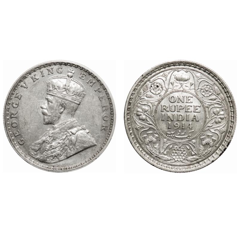 George V, Silver, Rupee, 1914, Calcutta Mint, No dot. F. Prid # 210. GK 1029. About Uncirculated. Scarce.