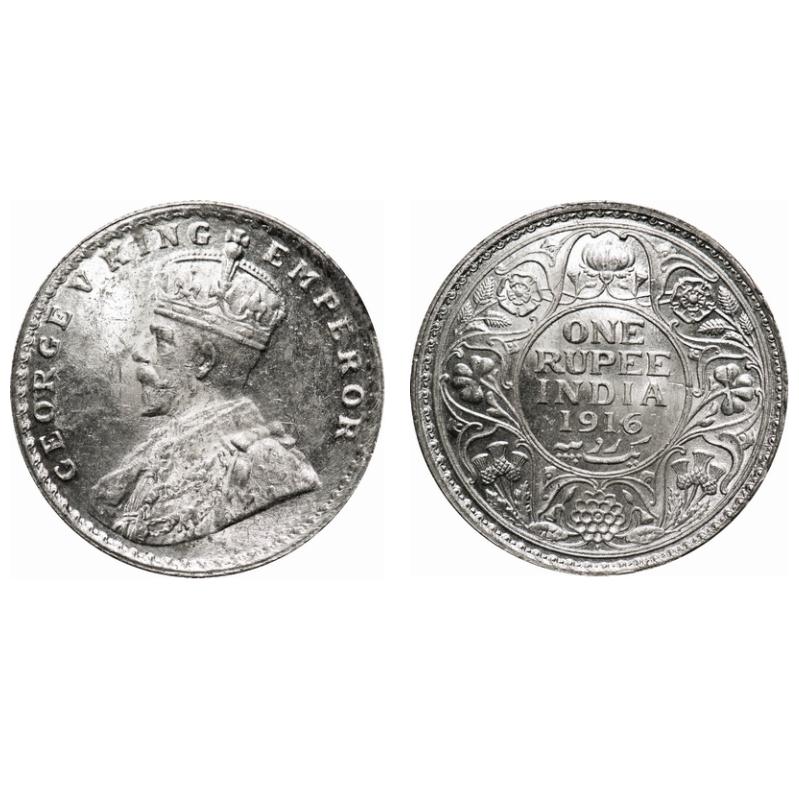 George V, Silver, Rupee, 1916, Bombay Mint, Dot, Die doubling of few alphabates in Emperor. F. Prid # 222. GK 1034. Brilliant Uncirculated with original mint luster. Scarce.
