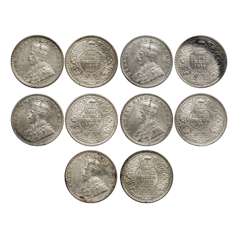George V, Silver, Rupee (5 coins), 1919, Calcutta Mint, No dot. F. Prid # 215. GK 1039. About Uncirculated to Almost Uncirculated. Scarce.