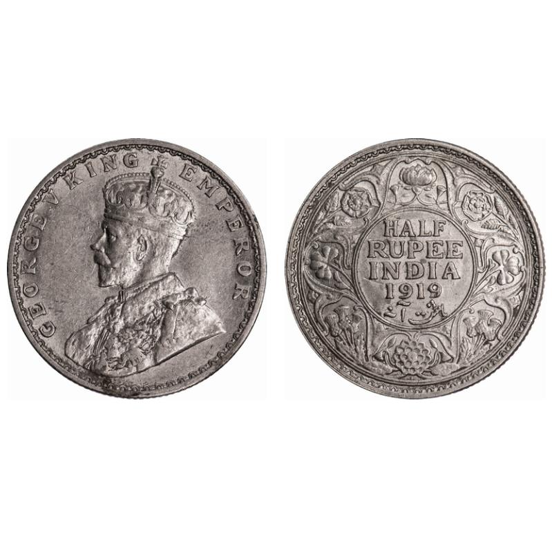 George V, Silver, Half Rupee, 1919, Bombay Mint, Dot. F. Prid # 343. GK 1057. Almost Uncirculated. Scarce.