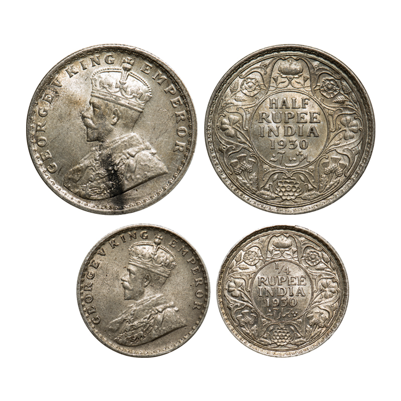 George V, Silver, Half Rupee & 1/4 Rupee, 1930 (2 coins), Calcutta Mint. F. Prid # 332, 451. GK 1072, 1097. About Uncirculated. Scarce.