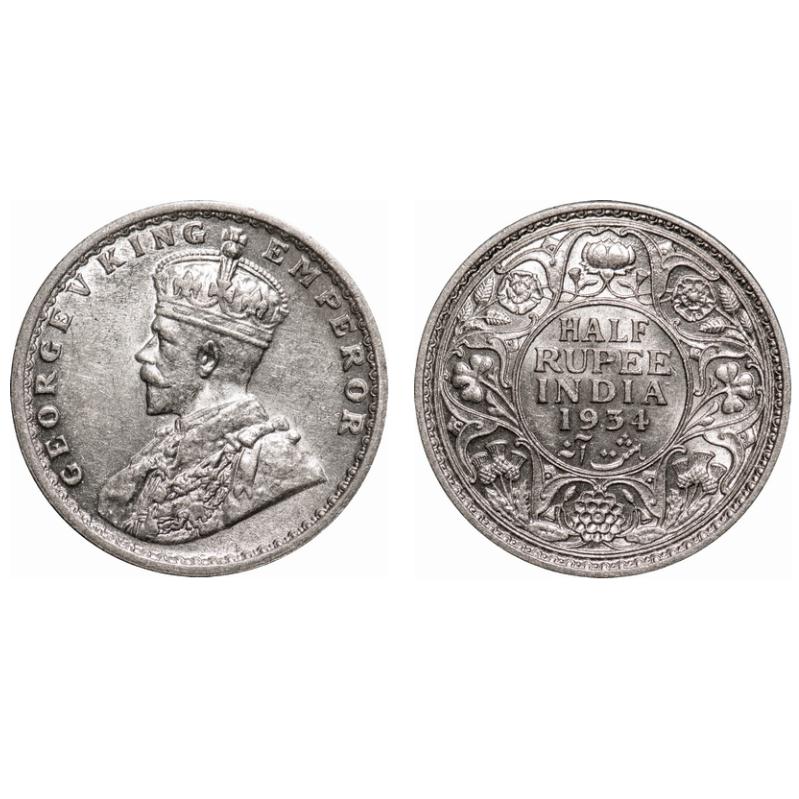George V, Silver, Half Rupee, 1934, Calcutta Mint, No dot. F. Prid # 334. GK 1074. Uncirculated with original mint luster. Very Scarce.