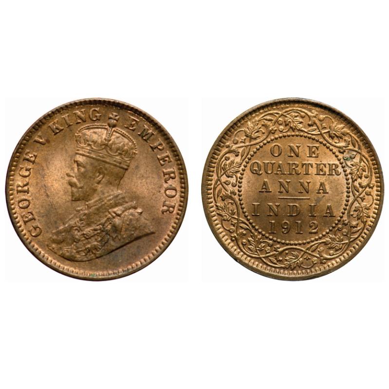 George V, Bronze, Quarter Anna, 1912, Calcutta Mint, No dot. F. Prid # 658. GK 1172. Uncirculated. Very Scarce.
