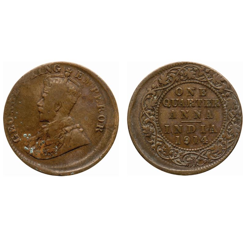 | George V, Bronze, Quarter Anna, 1914, (4.74 g) (25.67 mm), Calcutta Mint, No dot, Error, 15% die shift. About Very Fine. Rare. |