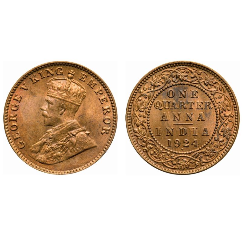 George V, Bronze, Quarter Anna, 1924, Bombay Mint, Dot, Ghost on Rev. F. Prid # 677. GK 1180. Uncirculated. Scaece.