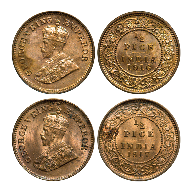 | George V, Bronze, 1/2 Pice (2 coins), 1916, 1917, Calcutta Mint, No mint mark. F. Prid # 749, 750. GK 1202, 1203. About Uncirculated to Uncirculated Details. Scarce. |