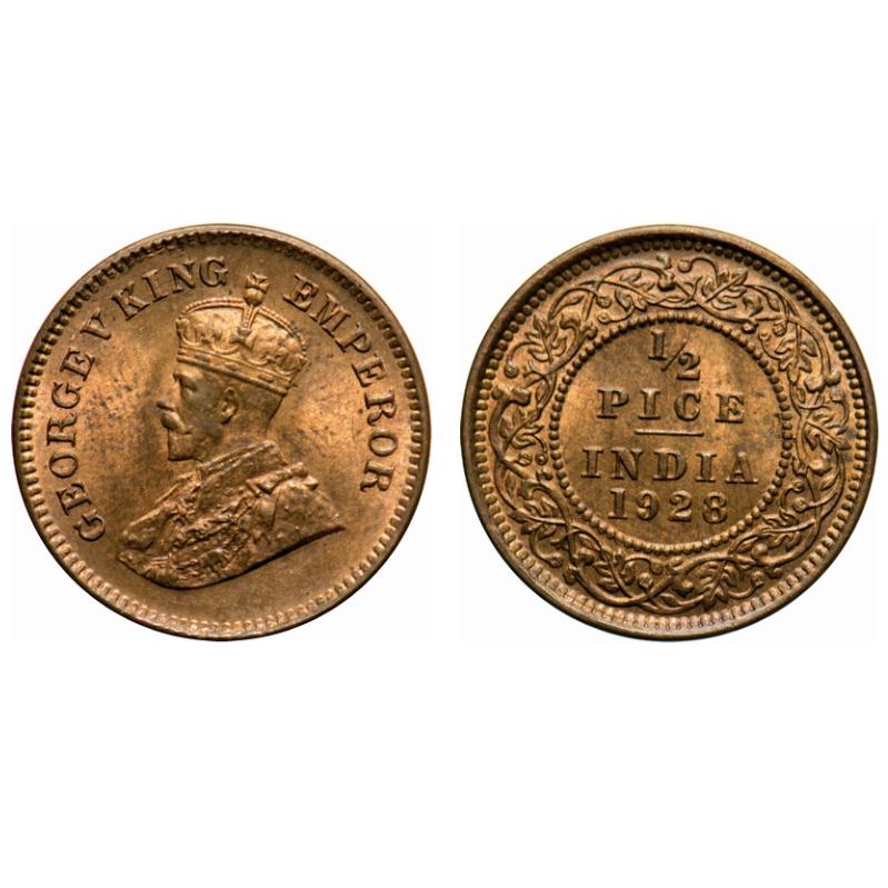 George V, Bronze, 1/2 Pice, 1928, Calcutta Mint, No mint mark. F. Prid # 761. GK 1214. Uncirculated. Very Scarce.