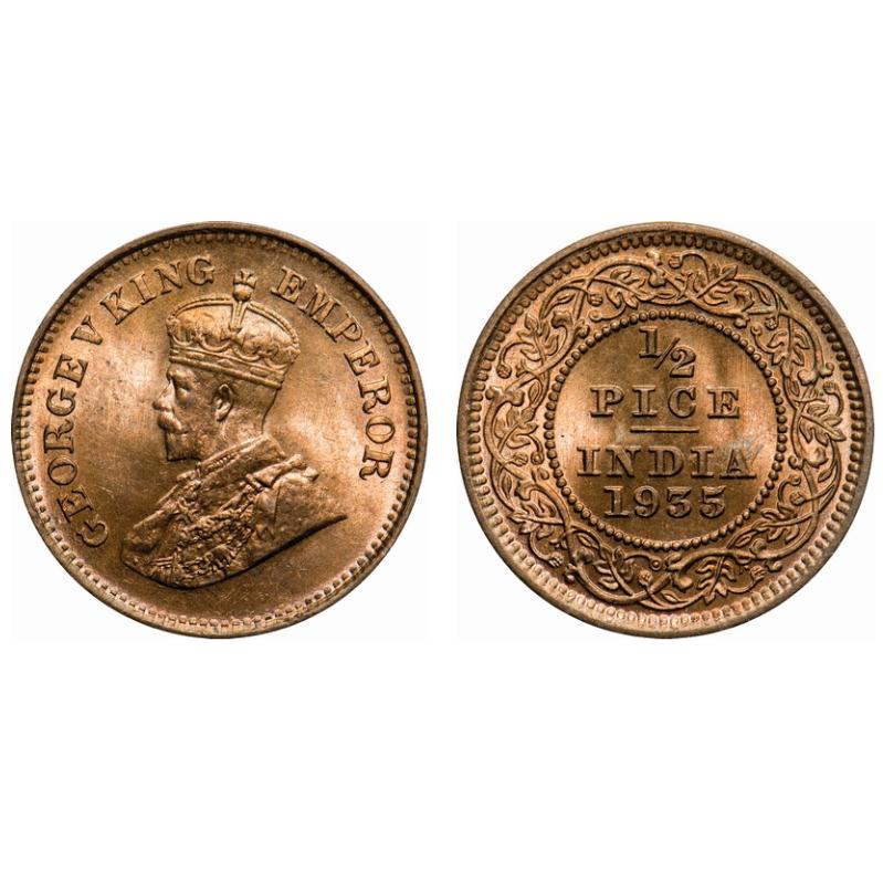 George V, Bronze, 1/2 Pice, 1935, Calcautta Mint, No mint mark. F. Prid # 768. GK 1221. Brilliant Uncirculated. Scarce.