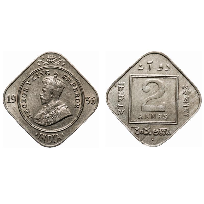 George V, Copper-Nickel, 2 Annas, 1936, Bombay Mint, Dot. F. Prid # 903. GK 1140. Almost Uncirculated. Scarce.