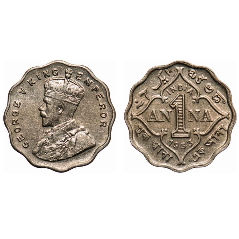 George V, Copper-Nickel, 1 Anna, 1933, Calcutta Mint, No dot, Die crack on Obv, Planchet flaw on Rev. F. Prid # 937. GK 1164. Almost Uncirculated. Very Scarce.