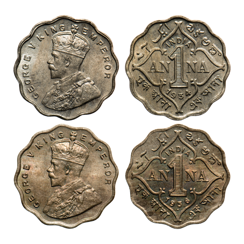 | George V, Copper-Nickel, 1 Anna (2 coins), 1) 1934, Calcutta Mint, die crack on Rev, 2) 1936, Bombay Mint, Dot, die crack on Rev. F. Prid # 938, 958. GK 1165, 1169. Uncirculated. Scarce. |