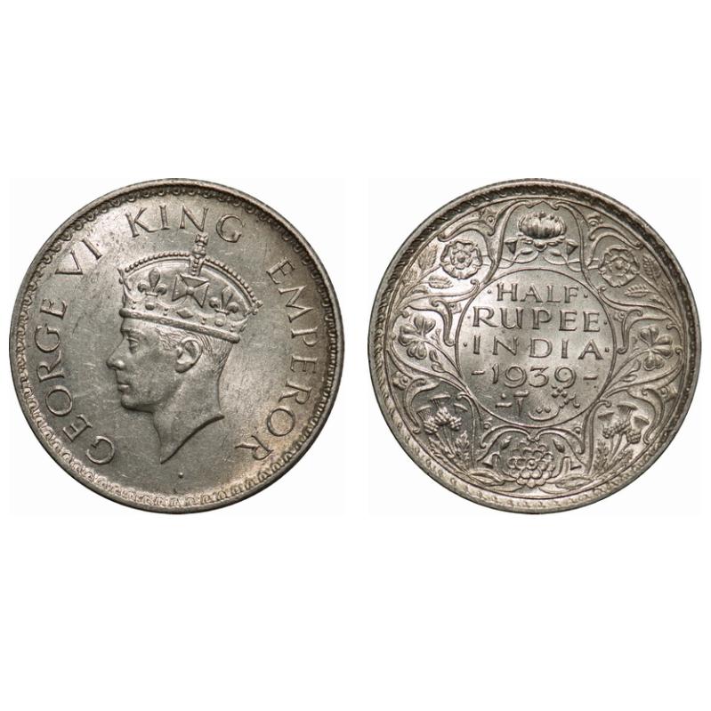 | George VI, Silver, Half Rupee, 1939, Calcutta Mint, Head type II, A(a)/I, No dot, Milled edge. F. Prid # 364. GK 1298. Uncirculated. Scarce. |