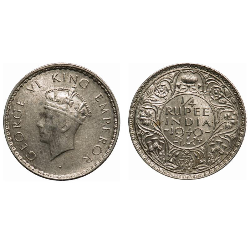 | George VI, Half Silver, 1/4 Rupee, 1940, Bombay Mint, Head type I, Rev I, Dot, Milled edge, Privy mark on Obv and Rev. F. Prid # 462. GK 1326. Extremely Fine+. Scarce. |