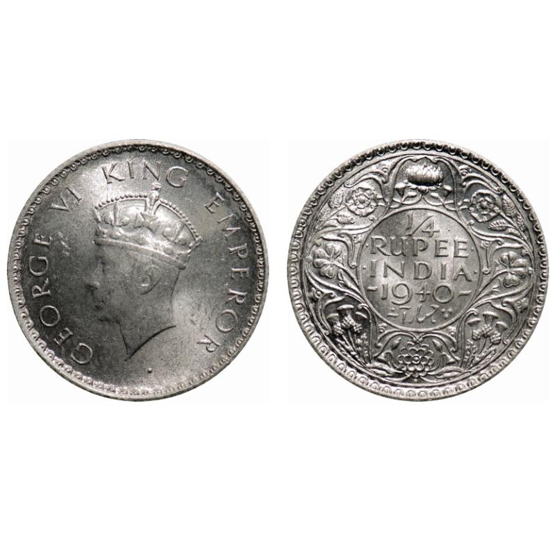 | George VI, Half Silver, 1/4 Rupee, 1940, Bombay Mint, Head type I, Rev I, Dot, Milled edge, A tiny privy mark on Obv. F. Prid # 462. GK 1326. Brilliant Uncirculated with original mint luster. Rare. |