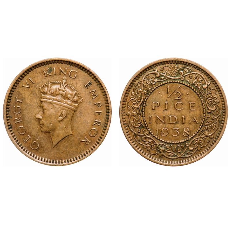 George VI, Bronze, 1/2 Pice, 1938, Calcutta Mint, Head type I, No dot. F. Prid # Unlisted. GK 1449. Almost Extremely Fine. Very Rare.