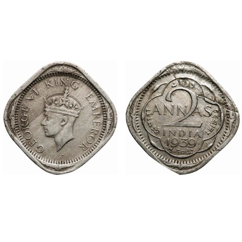| George VI, Copper-Nickel, 2 Annas, 1939, Bombay Mint, Head type II, Dots by year, Error, Broken retained die on Rev. F. Prid # Unlisted. GK 1349. About Extremely Fine. Rare. |