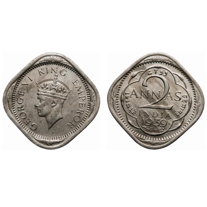 | George VI, Copper-Nickel, 2 annas, 1939, Bombay Mint, Head type II, Dots by year, Short trefoils in crown, Low relief effigy, planchet flaw on Rev. F. Prid # Unlisted. GK 1349. Uncirculated. Rare. |