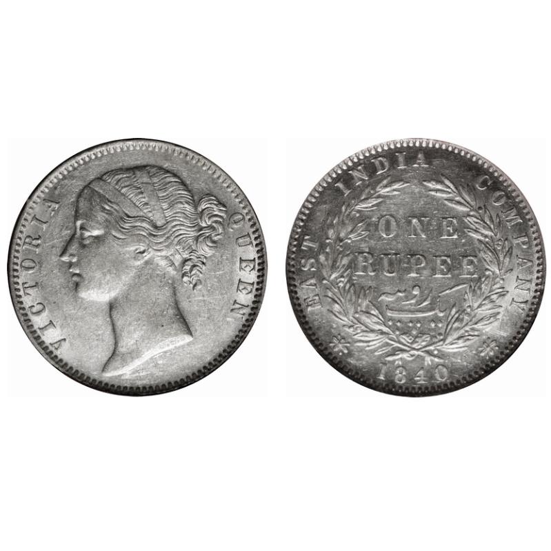 Victoria Queen, Silver, Rupee, 1840, DL, Madras Mint, W.W., 'R' raised, 1'o clock die rotaion on Re...