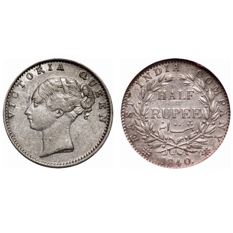 | Victoria Queen, Silver, Half Rupee, 1840, CL, Calcutta Mint, A/I, English head, Wreath with 19 berries (9L + 10R), Two leaves above 'F' of Half. F. Prid # 73. GK 119. NGS Slabbed XF 40. Very Scarce. |