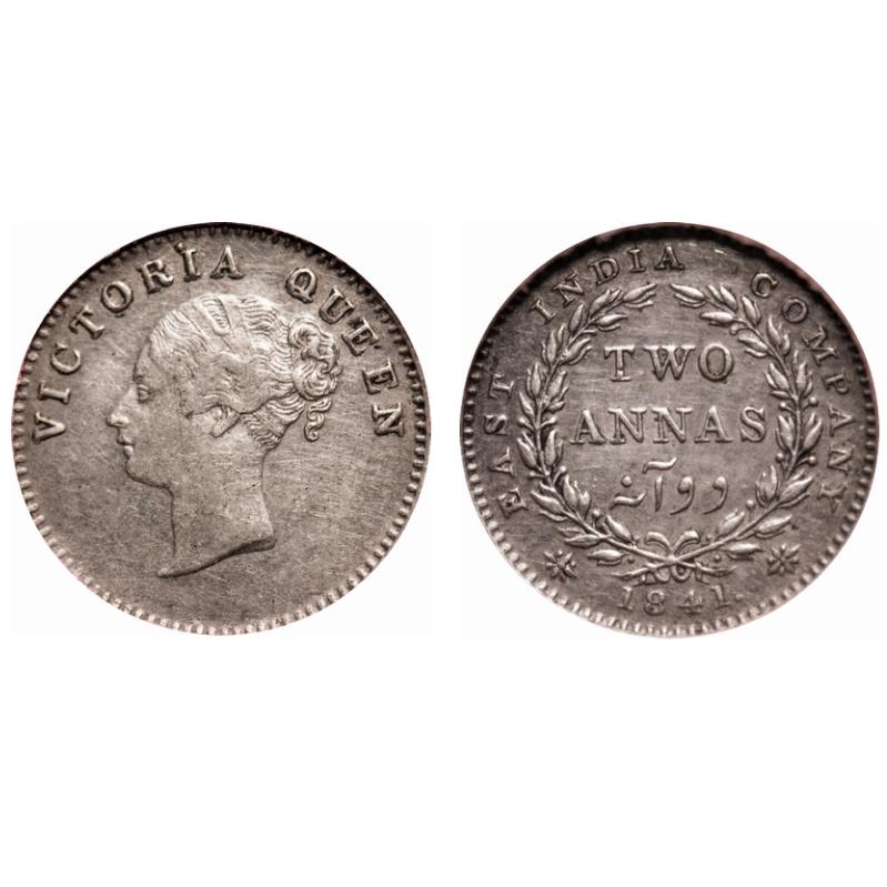 | Victoria Queen, Silver, 2 Annas, 1841, CL, Calcutta Mint, A/I, No curl of hairs on first hair band, Plain edge, wreath with 16 berries (8L + 8R). F. Prid # 114. GK 134. NGS Slabbed VF 35. Scarce. |