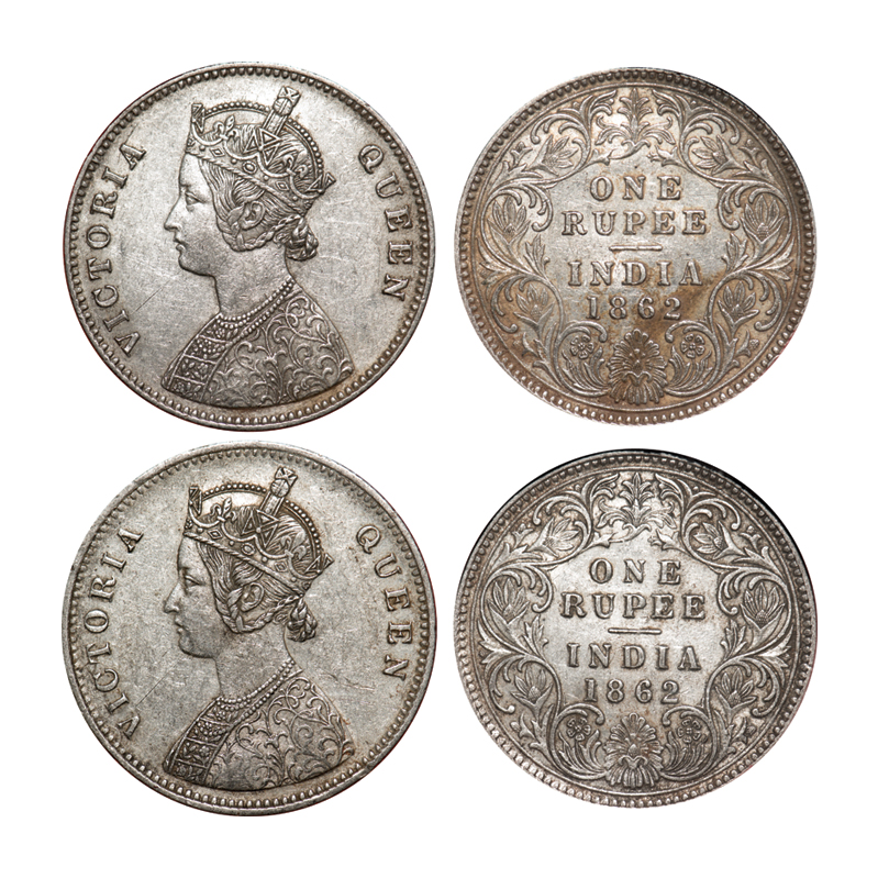 | Victoria Queen, Silver, Rupee (2 slabs), 1862, Calcutta Mint, 1) A/I, with initial 'J', 2) A/I, w/o initial 'J'. F. Prid # 66, 66. GK 255, 256. NGS Slabbed XF 45 Details, XF 40 Cleaned. Scarce. |