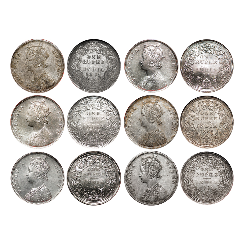 | Victoria Queen, Silver, Rupee (6 slabs), 1862, 1) Calcutta Mint, A/I, With initial 'J', 2) Bombay Mint, B/II/2/0, 3) Bombay Mint, B/I/0/4, 4) Bombay Mint, A/II/0/6, Complete 'D' in India, w/o initial 'J', 5) Bombay Mint, A/II/0/7, w/o initial 'J', 6) Bombay Mint, A/II/1/2, With initial 'J'. F. Prid # 66, 71, 80, 86, 87, 103. GK 255, 287, 309, 322, 329, 357. NGS Slabbed VF 35, XF 40 Genuine, XF 40 Details, VF 35, VF 35 Cleaned. Scarce. |