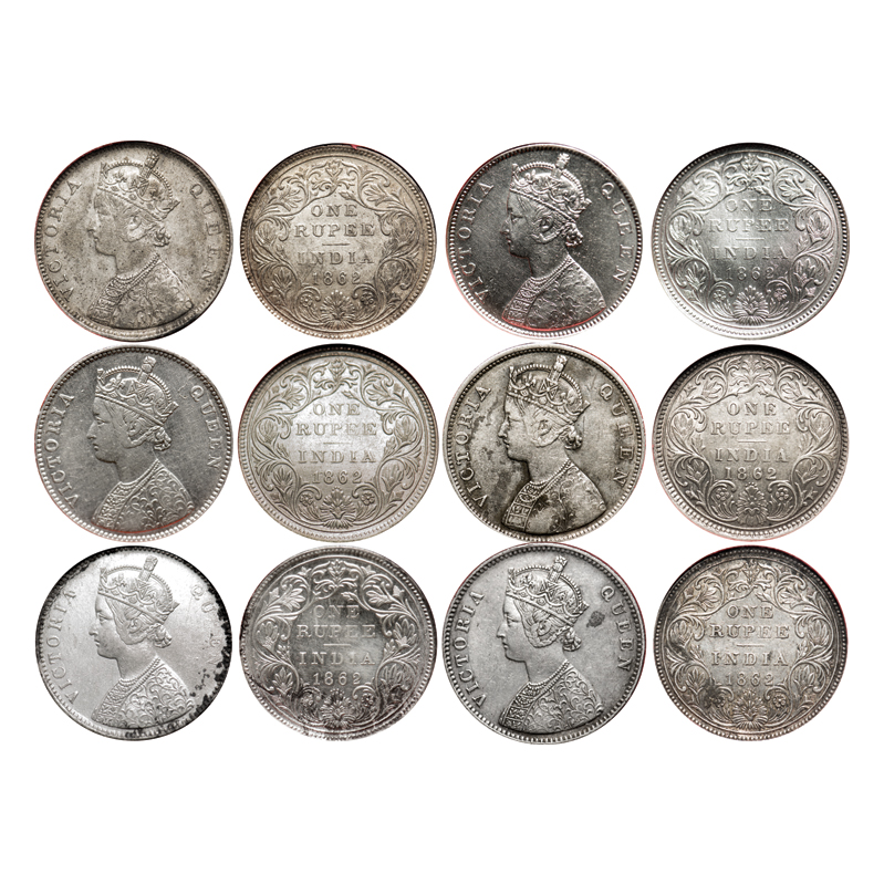 | Victoria Queen, Silver, Rupee (6 slabs), 1862, Bombay Mint, 1) B/II/1/0, 2) B/II/2/0, 3) A/II/0/4, w/o initial 'J', 4) B/I/0/4, 5) A/II/0/5, Broken 'D' in India, w/o initial 'J', 6) A/II/0/6, Complet 'D' in India w/o initial 'J'. F. Prid # 69, 71, 79, 80, 85, 86. GK 286, 287, 308, 309, 317, 322. NGS Slabbed VF 30, XF 40 Cleaned, VF 35, VF 30 Details Cleaned. XF 40 Cleaned, XF 40 Cleaned. Scarce. |