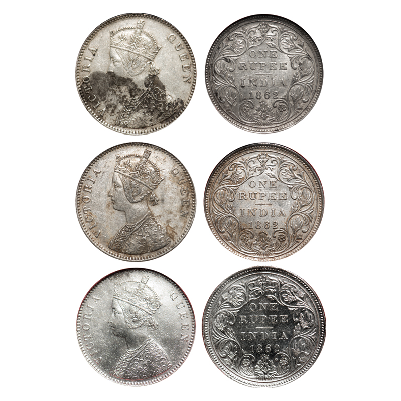 | Victoria Queen, Silver, Rupee (3 slabs), 1862, Bombay Mint, 1) A/II/0/4 w/o initial 'J', 2) A/II/0/5, Complete 'D' in India, w/o initial 'J', 3) A/II/0/5, Broken 'D' in India, w/o initial 'J'. F. Prid # 79, 85, 85. GK 308, 316, 317. NGS Slabbed XF 40 Details Cleaned (3). Scarce. |