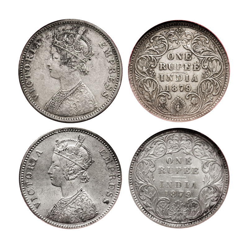 | Victoria Empress, Silver, Rupee (2 slabs), 1879, 1) Bombay Mint, A3/II(iv), Dot, 2) Calcutta Mint, A1/I, 'C' incused. F. Prid # Unlisted, 117. GK 462, 464. NGS Slabbed VF Details, Cleaned, XF 40. Scarce. |