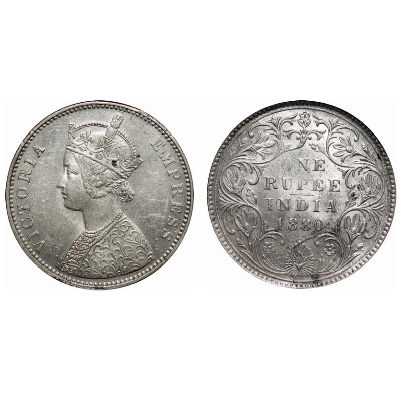 Victoria Empress, Silver, Rupee, 1880, Bombay Mint, A3/II(iv), Dot. F. Prid # Unlisted. GK 467. NGS Slabbed XF 45+, Cleaned. Very Scarce.