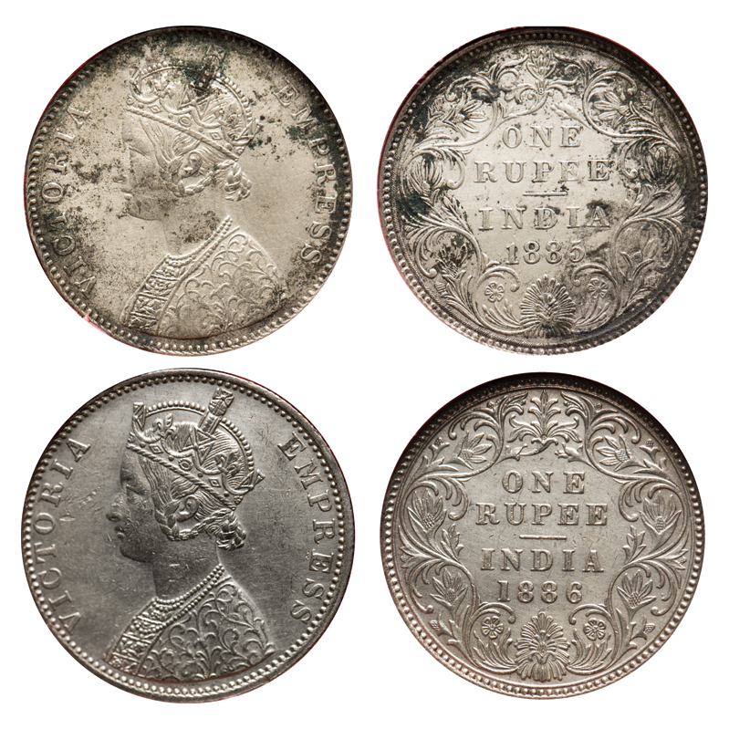 | Victoria Empress, Silver, Rupee (2 slabs), Bombay Mint, 1) 1885, A3/II(i), 'B' raised, Top stroke of numeral 5 short, 2) 1886, C2/I, 'B' incused. F. Prid # 168, 171. GK 496, 523. NGS Slabbed Xf Details, Cleaned (2). Scarce. |