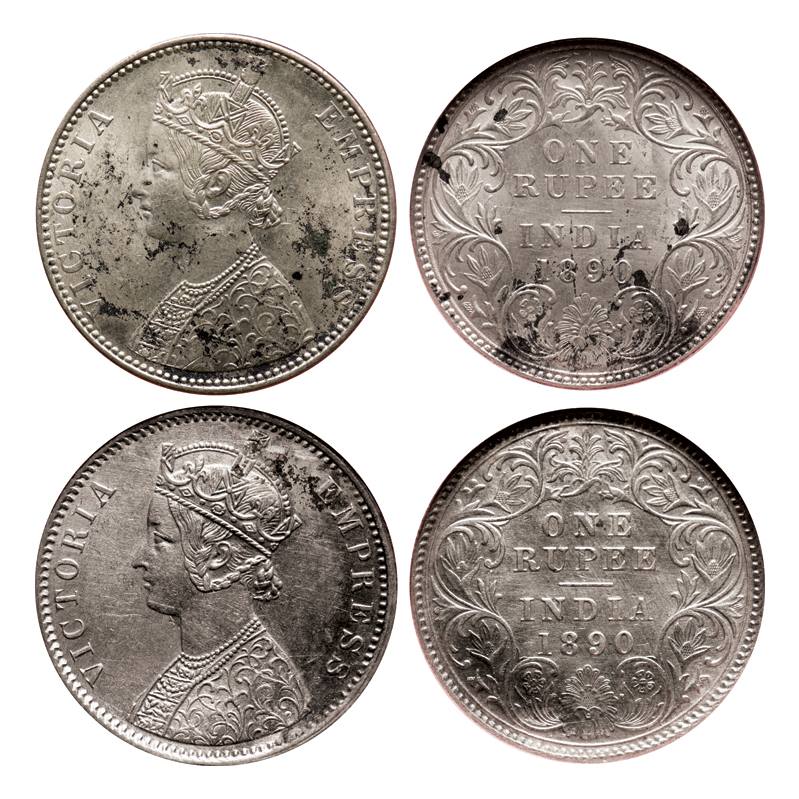 | Victoria Empress, Silver, Rupee (2 slab), 1890, 1) Bombay Mint, C2/I, 'B' incused, 2) Calcutta Mint, C3/I(i), 'C' incused. F. Prid # 178, 131. GK 566, 567. NGS Slabbed AMS 55 Details, AMS 58+ Details. Scarce. |