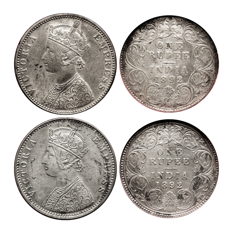 | Victoria Empress, Silver, Rupee (2 slabs), 1892, 1) Bombay Mint, C2/I, 'B' incused, 2) Calcutta Mint, C3/I, 'C' incused. F. Prid # 181, 133. GK 572, 576. NGS Slabbed Cleaned, AMS 50+ Details. Scarce. |