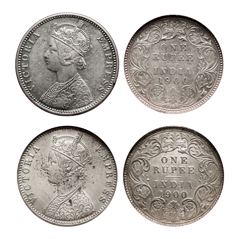 | Victoria Empress, Silver, Rupee (2 slabs), 1900, 1) Bombay Mint, A3(i)/I(ii), 'B' incused, 2) Calcutta Mint, C3/I(i), 'C' incused. F. Prid # 186, 138. GK 589, 590. NGS Slabbed XF 45+, AMS 55 Details. Scarce. |