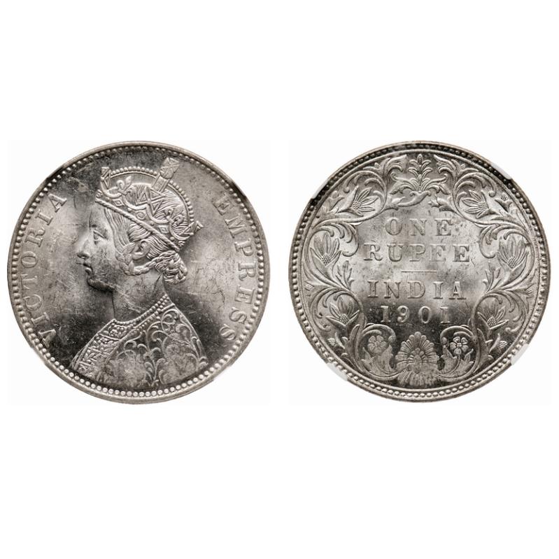 Victoria Empress, Silver, Rupee, 1901, Bombay Mint, A3(i)/I(ii), 'B' incused. F. Prid # Unlisted. GK 591. NGC Slabbed MS 61. Rare.