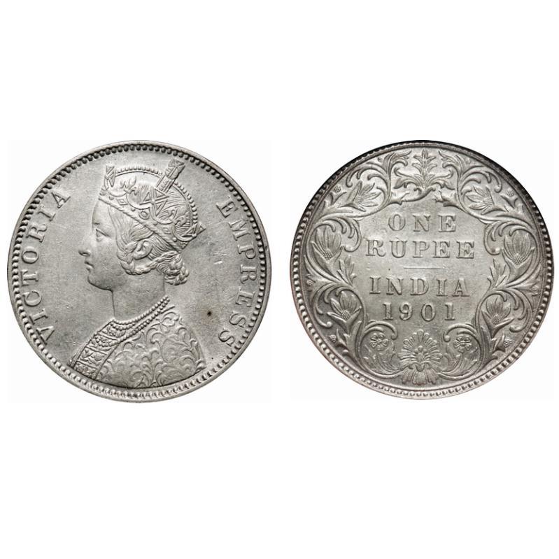 | Victoria Empress, Silver, Rupee, 1901, Bombay Mint, A3(i)/I(ii), 'B' incused, Partial ghost on Rev. F. Prid # Unlisted. GK 591. NGS Slabbed XF 45, Cleaned. Very Scarce. |