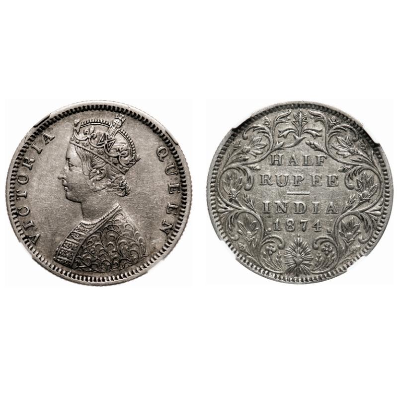 Victoria Queen, Silver, Half Rupee, 1874, Bombay Mint, B2/II, Dot. F. Prid # 285. GK 600. NGC Slabbed XF 45. Scarce.