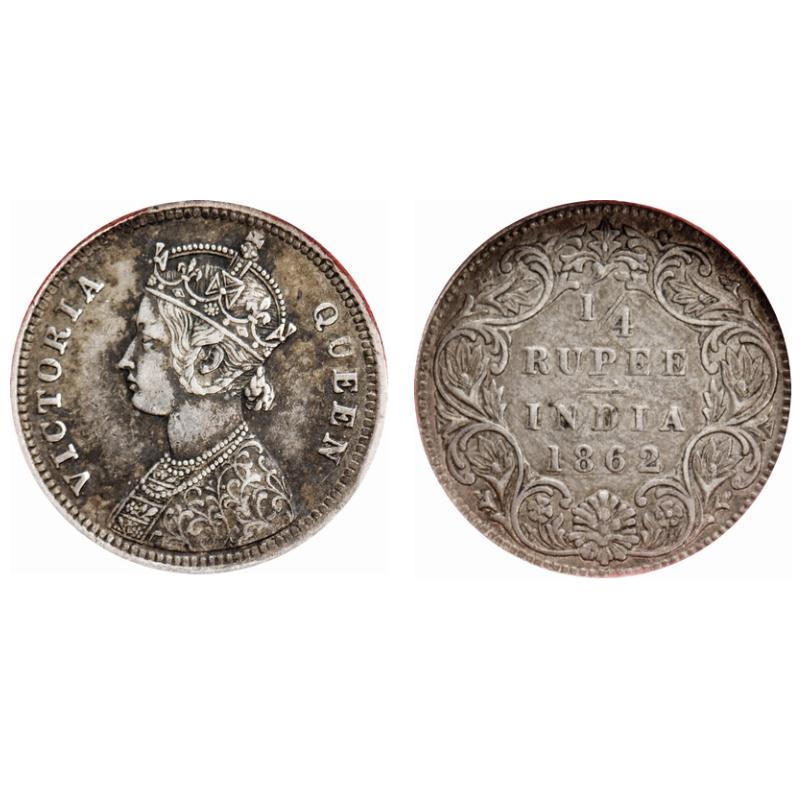 Victoria Queen, Silver, 1/4 Rupee, 1862, Bombay Mint, A/I, The flower tip just above the oblique stroke between '1' & '4' is thicker and longer. F. Prid # 377. GK 377. NGS Slabbed XF 45+. Very Scarce.