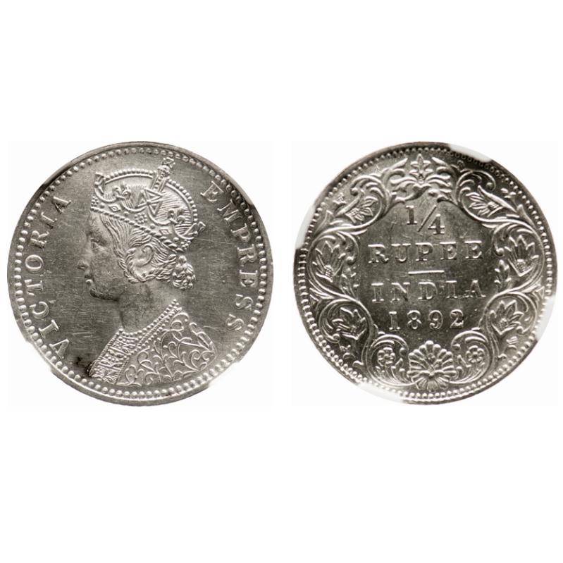 Victoria Empress, Silver, 1/4 Rupee, 1892, Bombay Mint, C(i)/I, 'B' incused. F. Prid # 427. GK 722. NGC Slabbed UNC Details. Scarce.