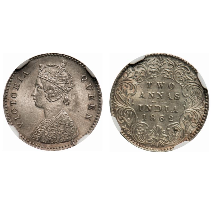 Victoria Queen, Silver, 2 Annas, 1862, Calcutta Mint, A/I, Bottom flower top 3 petals of same size, 11'o clock die rotation on Rev. F. Prid # 485. GK 380. NGC Slabbed UNC details. Scarce.