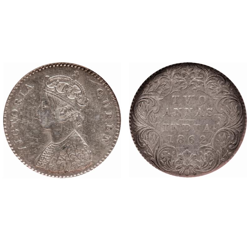 Victoria Queen, Silver, 2 Annas, 1862, Madras Mint, A/I, Bottom flower center top petal broader then the left and right connecting petals. F. Prid # 487. GK 384. NGS Slabbed XF 40+. Scarce.