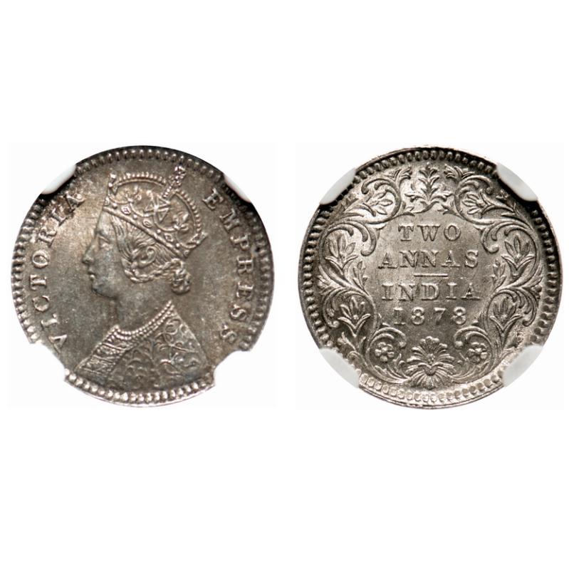 Victoria Empress, Silver, 2 Annas, 1878, Calcutta Mint, B/II, No mint mark. F. Prid # 493. GK 751. NGC Slabbed AU 58. Scarce.