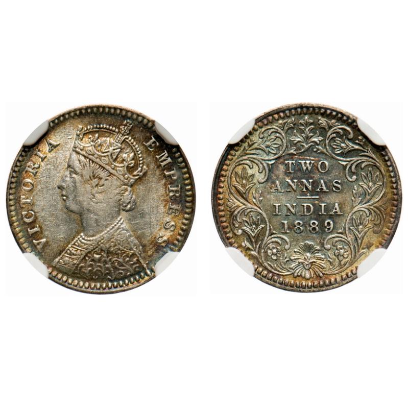 Victoria Empress, Silver, 2 Annas, 1889, Calcutta Mint, B/II, 'C' incused. F. Prid # 504. GK 788. NGC Slabbed XF 45. Scarce.