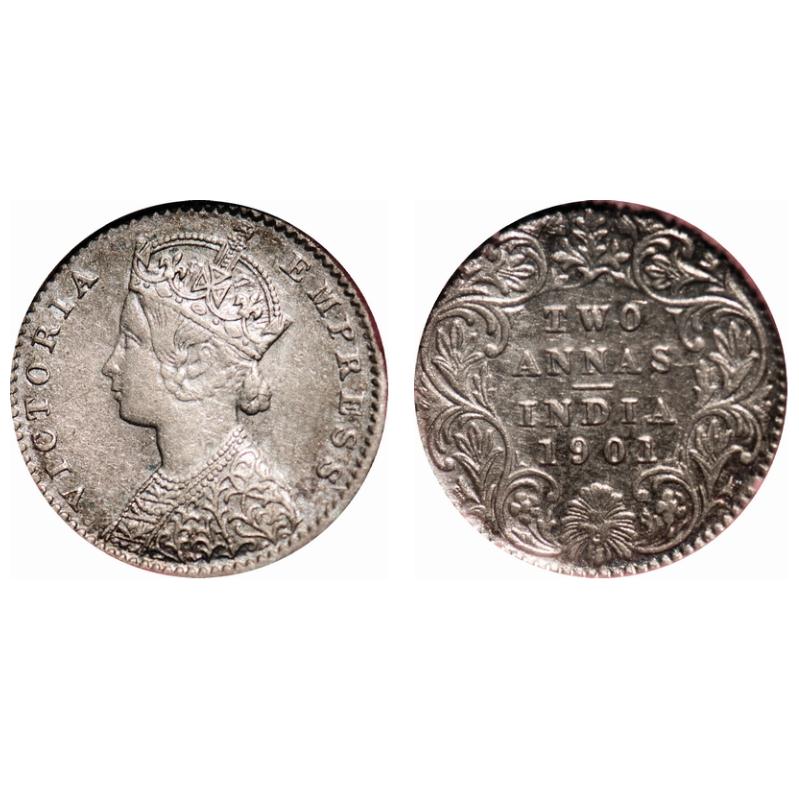 Victoria Empress, Silver, 2 Annas, 1901, Calcutta Mint, B/II, 'C' incused, Ghost on Rev. F. Prid # 515. GK 817. NGS Slabbed XF 40. Scarce.