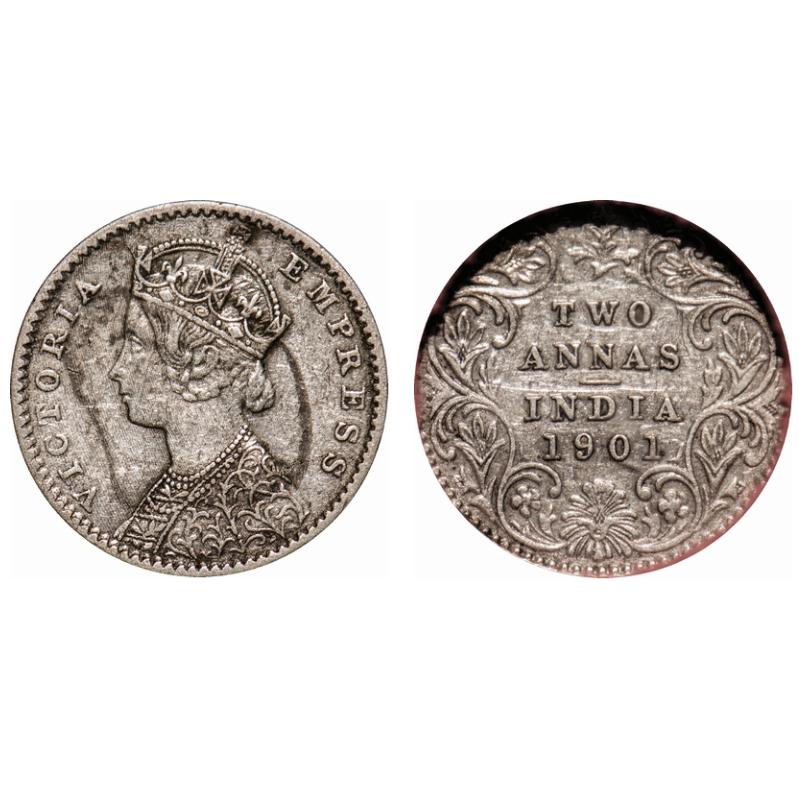 Victoria Empress, Silver, 2 Annas, 1901, Calcutta Mint, B/II, 'C' incused. F. Prid # 515. GK 817. NGS Slabbed VF 35. Scarce.